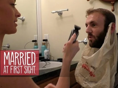 Jamie and an electric razor take on Doug's bushy beard.